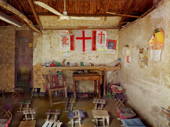 在《信仰空间》系列作品中,渠岩关注的是边远地区乡村的“地下”教堂。就像《权力空间》中的村长 办公室往往与民居无异,甚至就在村长家里一样;《信仰空间》中的乡村教堂也往往是破败的村舍,层 叠的条凳(及上面的坐垫)和室内的装饰(十字架、耶稣像和条幅),是宗教的神圣性的仅有表征。