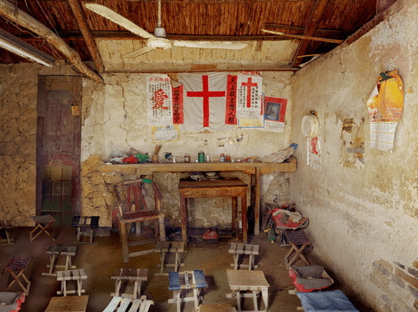 In the series of Religion Space, Qu Yan pays her attention to “underground” church in remote villages. Just as village administrative offices are in the village head’s residential houses in the “Space Power”, churches in villages are also within the dilapidated cottages in the “Religion Space”. The stacked bench (cushion above) and interior decorations (the cross, Jesus and the scroll) are the only religious sacred representation.