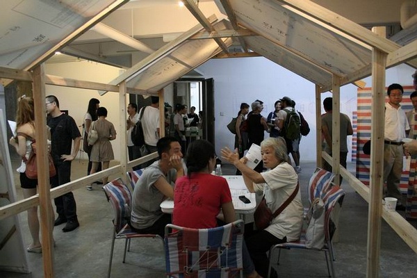 最近的一届关键词学校,发生在一个玻璃结构的小房子里。中瑞物流设备有限公司(青岛)是一家瑞典在华的外资企业, 生产如机场, 超市手推车, 酒店及其他盛物和搬运的车和框, 这个结构正是由这个公司废弃的,不合格的产品(wrong products)搭建而成。在这结构里将展示访谈的录像,其中部分录像也在研讨会中先睹为快了。访谈包括制作设计竹结构pavilion建筑师和其他建筑师艺术家。作为此届由德国歌德学院与证大喜玛拉雅美术馆合作的“更新中国”展览的一部分,这个名为“暂停与持续”综合媒体的项目也在美术馆所在的大拇指广场上进行了两天的现场互动。现场谈及的问题包括:关于持续性发展,全球化环境下,中国或者发展中国家作为全球加工厂,发展对当地环境的的影响,全球加工厂发展对于中国及当地社会人群意识的影响;对于美学持续发展的看法;对于发展的看法,对于创造性的看法。