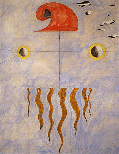 这一系列纸本绘画是Miró小宇宙最生气勃勃的爆发,画面中的符号与象征物系统如今已为我们所熟识。画面中的梯子对他有着持久的吸引力与巨大魅力;它是他企图将其绘画置于一个截然不同的境界以理解这个世界的隐喻,作为逃脱单调现实的一个出口;由此这一系列也成为了飞翔的某种姿势。在这一创作时期Miró写道,“我有种深层的强烈欲望想要逃脱,我故意关闭了内在的自我;夜晚,音乐和星辰开始成为我绘画的主角。”