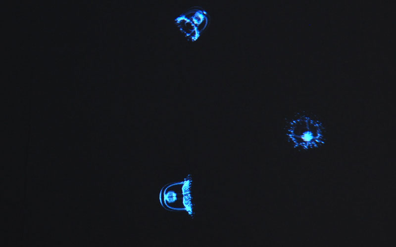 最后值得一提的还有来自中国青年艺术家徐文恺(aaajiao)的一件计算机衍生动态影像装置《生命映射 – 道恩灯塔水母》(Life Mapping – Turritopsis nutricula),这一作品利用程序模拟道恩灯塔水母的生命特征。道恩灯塔水母是迄今已知唯一能在性成熟后重返幼年期的多细胞生物。艺术家试图在新的维度中模拟一种可以不死的生物,由此探讨维度的永恒性,抑或是存在和消亡的关系。作为进化论的一个例外,徐文恺用程序算法生成了一系列道恩灯塔水母的生动影像。