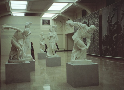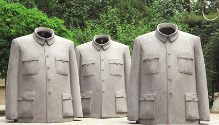 当时还做了些别的作品,也是对身边的材料进行处理改造,运用材料表达,比如当时还用枕木做了一件作品。这个时期,我已经避开了使用泥塑(即写实雕塑),原因是觉得自己始终处于古典大师的阴影之下。无论技艺多么纯熟,充其量也就只能做些人像,稍微加点个性,这类创作方法对我来说无法表达当时内心的想法,从而也就搁置了写实雕塑的运用。直到这件《殛》在日本巡展时,当地的一个策展人问我为什么从央美科班出生却不用写实雕塑,我才真正发觉这其实是我的一个局限。虽然当时较为敷衍地回答了他,说把作品做得大一些、身在其中,多种材料的处理显得标新立异等等;但其实我自己心知肚明,这个问题刺激了我,开始让我意识到无法用写实雕塑表达自身想法的遗憾。打个不恰当的比方,正如京剧表演艺术家一定须用古人的话来在台上表达喜怒哀乐,那我为何不能用古人通道来实现自身的表达呢?在其后的1997年上半年,我前往澳大利亚墨尔本担任当地一个大学的客座教授,一次研讨中我与同事谈论到了中山装,这凝聚了中国100年革命文化的缩影。同年我参观了孙中山故居,更坚定了我用中山装做件作品的想法,它代表着某种已逝潮流。虽然当时已经退出了历史舞台,但它与中国对文化、身份的关系,与个人的关系、与来自国外的影像有着某种微妙而密不可分的关系。我们这辈人都是在接受一系列社会主义教育中成长的,这些外来的象征很多都被我们借来作为武器,比如马克斯理论就是当时我们找到的一件武器。所以从中山装出发,我们可以思考所有这些与我们的真正关系。于是我从小模型开始,逐渐放大,直至做到2.4米高,我觉得终于分量够了。这一系列对我而言很重要,为我重回写实雕塑、运用其学院派的语言、技巧表达自我认识打开了新一扇门。以下作品图片中展示的是这一系列在2000年参加上海双年展时的现场照片。