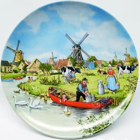 2008年,逢北京奥运会,有一家荷兰的画廊在北京开张,邀请我和一名荷兰艺术家合作办一个双人展。展览前期,荷兰艺术家到了北京,我们见了几次面,商量展览怎么做;他带给我一个见面礼,是绘有荷兰19世纪田园风景的画盘。我觉得特别美,就有想法把画盘上的人物摘下来,做成立体的挂起来。于是我把画盘里的船只、奶牛、周围元素都做成真实尺寸,并以60°的倾角倾斜悬挂。这60°是这么来的:站在北京垂直于地面,距离荷兰6600公里;从北京和荷兰各向地心引两条垂线,其中的夹角是60°。所以在中国看荷兰,整个儿都斜起来,由此用倾斜体现了空间。所以我们手绘的背景云彩,也是倾斜了60°。