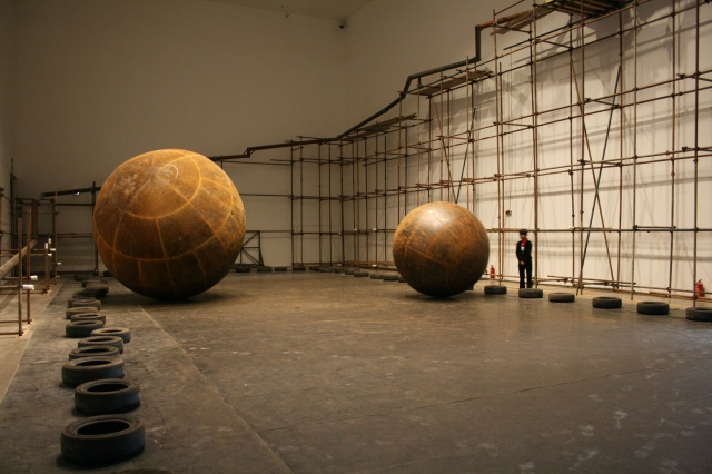 2009年,今日美术馆邀请我做一个展览,我去他们美术馆一看,觉得像个15mx30mx12m的大盒子。作品《运动的张力》将一大(3m6直径)一小(2m3)两个球放进这个大盒子,并让其不停滚动;这与常见的作品静止、被动地在场馆中等待观赏恰恰相反。观众需要全神贯注地应付运动物,这形成了某种对话。在展厅四周排布一圈高低错落的管道系统,其中放置了好几枚重7kg的钢球,它们每到一个管道转角就会发出撞击声,当滚动到达底部之后有统一的拉升装置将之送到起始高点,如此循环往复。这些撞击声告诉你空间,并穿透墙面,吸引馆外人进来参观。两个滚动的大球内置充电装置,隔夜充电之后可以连续运动10小时。