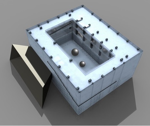现场图片中可以看到沿着场馆围了一圈轮胎,是因为在布展过程中测试时,球撞上了脚手架,结果把脚手架撞到墙里去了。轮胎有弹性,起到了保护作用。如果把美术馆看做是个封闭的盒子,小球在小管道里运行,人们只能听到它们运动的声音,却无法看见;大管道里是两个大球在运动,人需要对之做出积极的回应;而处在盒子里的人,却也处于这两根嵌套管道之间的夹层中。作品探讨人的身体如何感受空间。