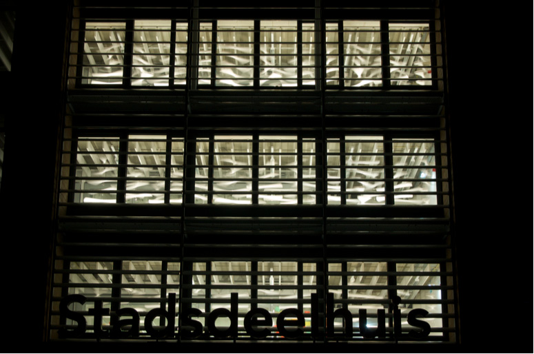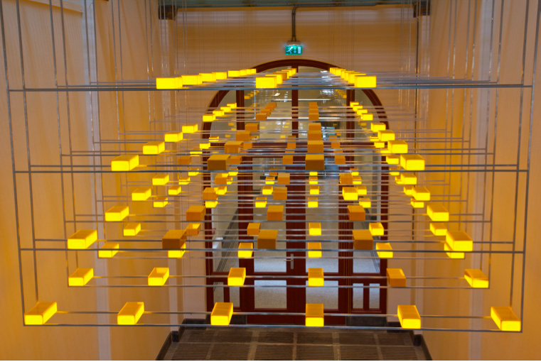 对上述评论的最佳佐证,当数Raamsteeg 2(2010),这件受荷兰自然历史博物馆委托的作品将建筑本身的外墙黄砖挪进了室内,星罗棋布的方块状黄色灯光沟通了建筑内外。黄色方块依照预置的程序逐次缓缓点亮,有如马灯,澄黄的灯光日以继夜,谱写着时间流逝,不失为对历史博物馆的美妙注脚。艺术家更将其形象地比喻为博物馆中的展架。另一同是委托定制的作品是StadsdeelhuisOost(市政府东楼,2009,标题即委托方)。Vink同样借用了建筑外墙金属笼状结构并转化至其室内灯光装置上,多串白色长条轮次旋转,天花板上交错流动有如涟漪的投影来自沿着窗户一字排开的简易射灯。这种如假包换的动感其实在Vink多数作品的灯光切换中均有所感。