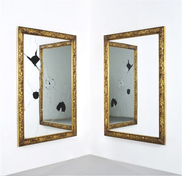 “二缺一”(Two Less One),两面大镜子镶着镀金框固定在墙角,互相反照。其中一面镜子被皮斯特莱托在一次表演中用把斧子击碎。尽管镜面破碎,但其反射力依然存在,事实上,碎片几何级数般增长了反射画面。每一片不规则的碎镜面不论其面积多大,都从某种层面上延续了与之相邻的那面大玻璃的整体存在。镜面与镜面的重复反射又映衬了一句梦幻般的法语老话“戏中戏”(mise-en-abyme)。