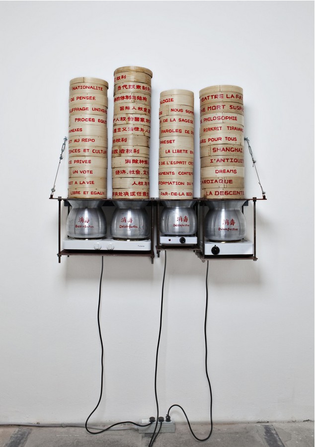 乍一看,这件作品好像只是一套蒸笼烹调系统,只不过烹调的不是食物而是书。她展现了对人类最为重要的两种营养素:物质的与精神的。有时这两种不同的“食物”可能导致消化问题,但它们都能像病毒那样感染我们。我们如何才能接受不同、取他人之长补己之短?我们如何才能将病毒转化成补药从而强身健体、美化心灵? 这是我们所有人都需面临的挑战。