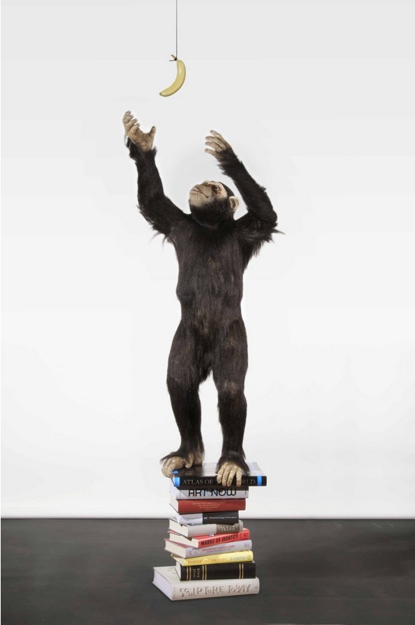 Elmgreen & Dragset这件新颖而幽默的作品“知识果实”(The Fruit of Knowledge)是对这一实验的精彩戏说,作品中的条板箱被大开本的书籍所替代。这只富于创意的猩猩把书籍堆起来以便够着头顶挂着的香蕉,这同时反映出书籍内容本身的另类实用:写满当代文化理解的书页变成立柱,对人类亦有所启发。