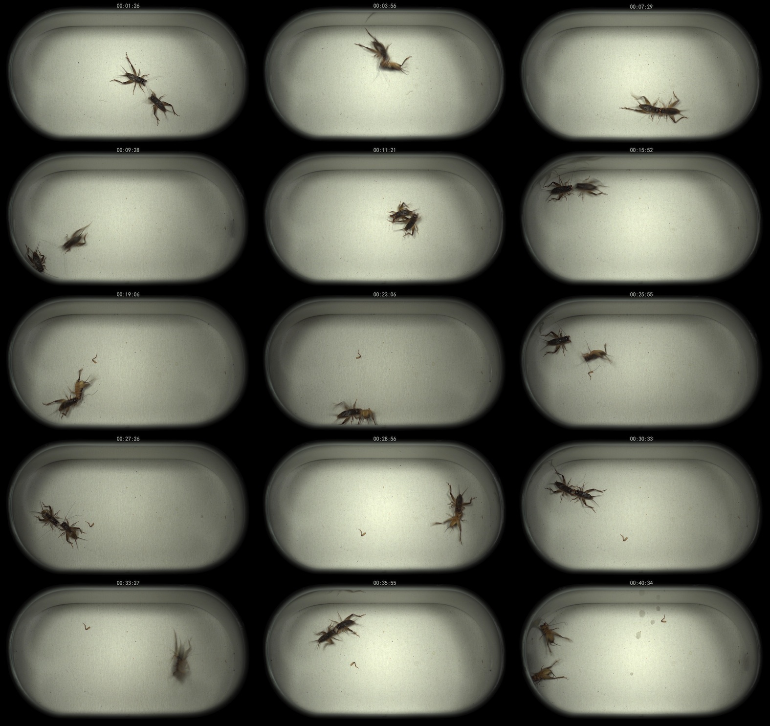 人嗜观兽斗,古今中外莫不如是:意大利西班牙人与兽斗,中国多有斗鸡、斗狗、斗蟋蟀。录像呈现漫长而残酷的挑逗之斗,个中奥妙享受匪夷所思。败者被胜者割下一条腿作为战利品,战利品同败者抑或胜者的遗像同场展出。画廊告知艺术家并不以此为意,而以蟋蟀拟人、以单词编号、以代码指挥、以时间话题。笔者以为这着实啰嗦了,一篇《促织》足矣。