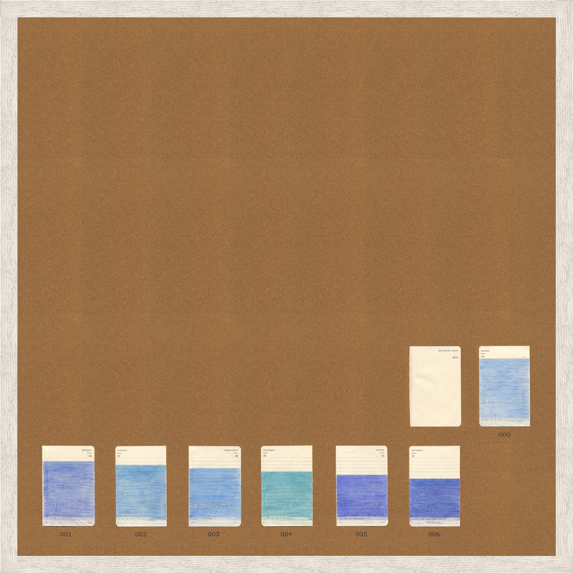 看过区凯琳早前绘画的人,或许更容易理解地下空间中展出的《爸爸,你今天看到怎样的蓝?》。在记事本或练习本上好像随手画一般,让区氏的绘画看来像是她个人心情的随笔。不过,绘画之于随笔,更像谒语,需要读进去,若只草草掠过,则品尝不到个中的浓味。通过对时间的标记,每张蓝都有不同的海拔高度,挨个按着当月的日期顺序排列,如此记录爸爸已经“出海”多久。每日做,就变成生活的一重惯例,不仅是眼前所见的薄纸片,更是每日那一刻伏案画下一种新的蓝时,身体的兴奋与矜持。