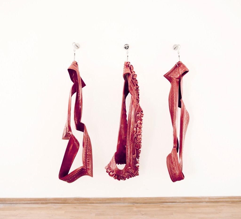 第一眼看到这些悬挂的画框,你并不会觉得陌生。这些画框是你所熟悉的那种古典油画的装饰性画框,有着纷繁的雕刻图案。不过这些画框并非僵硬的金属边框,而是用柔韧的、有些厚度的聚酯纤维做成的。于是当它被一个吊钩悬挂起来时,由于重力的作用,比较自然地耷拉下来,原本的每个直角也都扭曲起来;有几件还被艺术家刻意地多扭曲了一些。我说你不会觉得陌生,是因为它们被悬挂的方式。有三件是血红色的、带着某种牲畜肉类的质感,被挂在屠夫所用的那类吊钩上;有几件是闪亮的银白色,被挂在钢制衣架上。