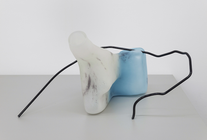 在配合香港个展的出版文字中,Snobeck介绍说“储液罐”系列是对引擎储液罐的忠实复制。这些吹制成型的中空玻璃造物或表面平坦、或留有沟槽,并且在别处或呈球状、或有褶皱、或细长、或像是被捏扁的——糟糕的物理特质,这复制了来自高温或使用对塑料罐子造成的损害。每一个容器都是圆的,即使打开的时候,泛着三种乳白、乳蓝和乳粉色的哑光玻璃,其部分表面有浅黄或浅棕的斑驳印记。每件雕塑都伴有一根细黑光亮的玻璃管,或从开口处伸出,或围绕着造物,以此模拟储液罐的水位感测器。在《楔形和堵塞》中的一件作品里,Snobeck甚至还在主储液罐旁边添了一个小型黑泵作为感测器的一部分。正如与之配对的玻璃造物,这些细黑玻璃管从储液罐的原语境中剥离出来,显得既直白又隐晦,其蜿蜒的形态时而即兴、时而规矩。