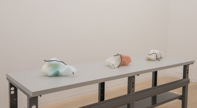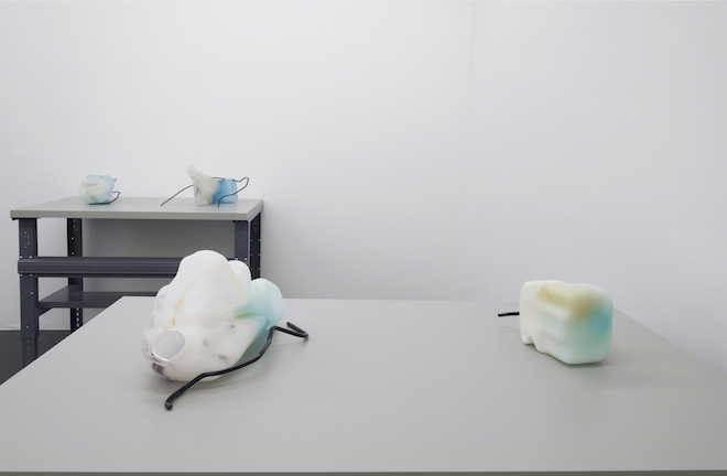 Snobeck先前的展览已然揭示出她对现成品、半透明与陈旧材料的兴趣。她在Essex Street的上一次个展“大美容沙龙”(Grand Beauty Salon,2012)取题于画廊对面的一家发廊,用了真的焦油和一点点多少由大海塑造成型的塑料制品。“储物箱”与之类似,让人联想到被回收的玻璃或塑料垃圾,它们在时间中变形并漂浮。以新材料复制现成物并以雕塑形制展示的这些作品传达出对转换变形的信赖以及对常见形态所存有的诗意潜质的关注。Snobeck将塑形玻璃视作一种器皿,一种对有机自然的蒸馏。以她自己的话说:“用吹吸阀做雕塑,在周遭的氛围里呼吸,捕捉海洋与植被,消耗并最终推入塑形模具的中空里。”玻璃韧性在艺术家眼中成就了作为时间化身的器皿。