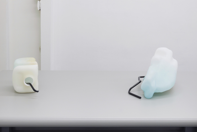 然而在观者看来,这些从日常语境和功能中被抽离出来的形态,以及把基座与法庭检查员办公台相结合的金属表面的额外维度,为作品提供了其他的诠释可能。“储液罐”系列或可被视作对环境政治的反思,考虑到刚在巴黎签署的迫使多国保证降低碳排放的历史性环境协定,这是一个适时的话题;而如今对塑料、纸板等材料的回收利用受到法律上的强制执行,在展厅中,观者所见则是被回收再用并做成雕塑的消耗品。在一家高档画廊中摆在工业基台上的Snobeck的雕塑作品模糊了艺术珍品与厂方回收废料之间的区隔。她的“储液箱”系列一如其易碎、略显抽象的塑料罐表亲那样,随波逐流并被冲上纯净的海岸,成为可供冥想的器皿。通过类似的形态与材料,此次展览将价值自身的流动性本质的认知托出水面。