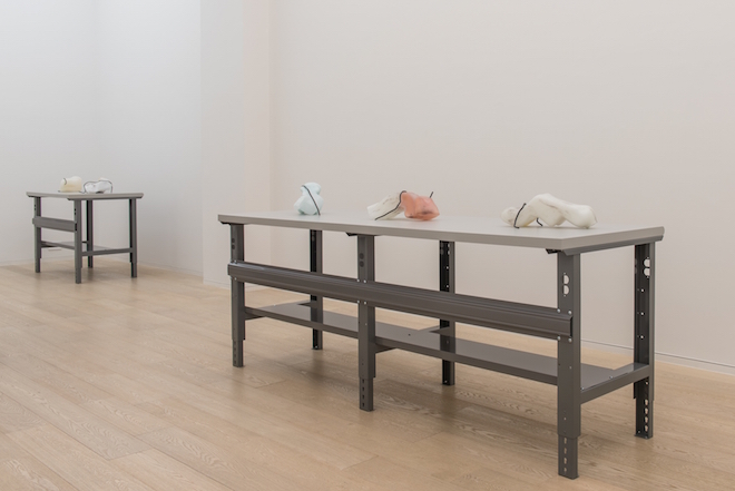 近期在纽约Essex Street 与香港Simon Lee 画廊展出的Valerie Snobeck的系列雕塑“储液箱”看上去更像是供实验研究的样本或工艺品、而非艺术作品。“储液箱”系列根据主题被分成了三组进行展示:《楔形和堵塞(Wedges and Jams)》、《大小弯曲(Large and Small Bends)》、《影子与轮廓(Shadows and Silhouettes)》,均完成于2015年。在Essex Street中,这些作品被放在几张一字排开的金属桌上,此种展陈体现出这名常驻纽约的艺术家对打破传统互动的参观动线的企图。