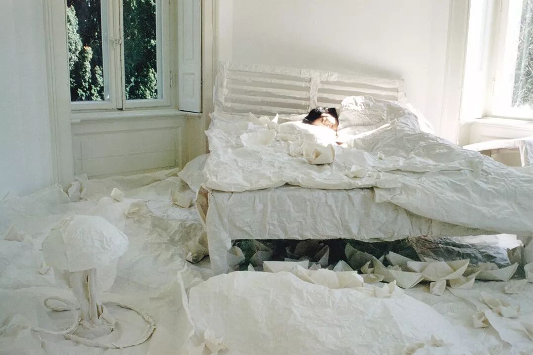 白色房间,阳光从右侧窗户跑进来,蹦到蜷在纸被子里的段英梅的脸上。纸糊的床歪歪斜斜,但看着她躺在上面很舒服,一个小女孩的样子。左后方的一扇窗,透着屋外的绿树和更多的阳光。地上散落着大大小小的纸船。