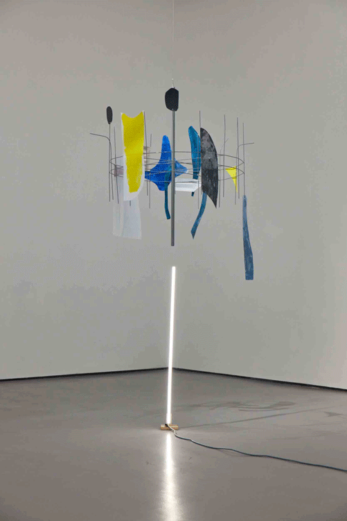 展厅里最引人瞩目的是一个高高的跑马灯状的装置,让人第一眼想到亚历山大·卡尔德;好像是从马蒂斯的剪纸中裁出的彩色的不规则色块,曲线轮廓的居多,挂成一圈,匀速旋转。