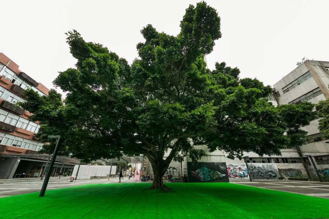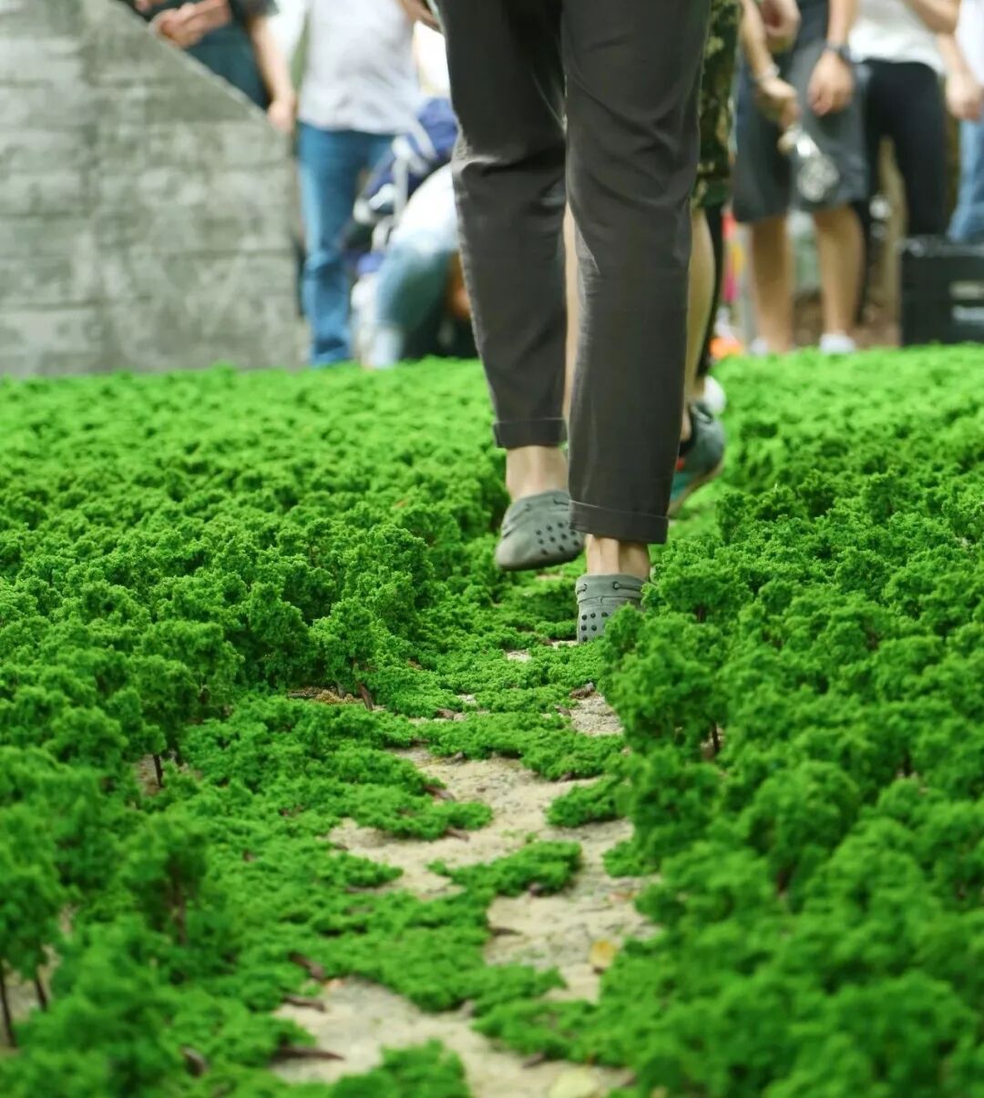 杨诘苍用书法做楼体立面涂鸦(《Everything is ok》,2008-2018);王思顺把一块石头放大成一座小山(《启示18 3 14》,2018);郑国谷将古人的“心像”以旋转投影灯的方式打在地面上,还在一棵大树下铺了块更大的鲜绿色草皮(《心能转境》,2018);杨心广做了7000棵手指高的小树,并在这片迷你森林中踏出了一条小路(《小路》,2018);肖昱将竹竿中段劈成细条,以群竹演绎张扬的舞姿(《易位》,2018);尹秀珍的雕塑是一片高高低低的尾气管阵列,观众可以带来小盆植被放在管口(《种植2018》,2018);以及何健翔用PVC塑料管搭成的方亭,地面上密集的管阵既是观众席,也是灌入水土期盼植物生长的容器。