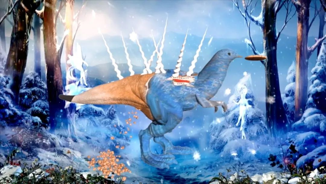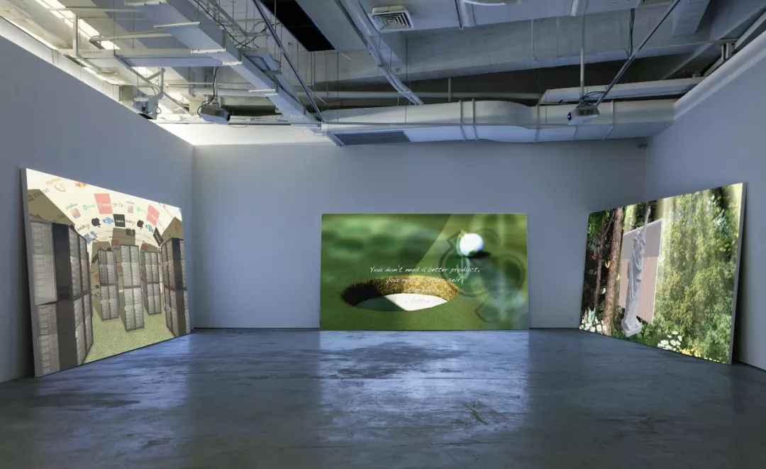 走到里面还有一间放映室,三块大幅画布作为投影幕靠着墙,三屏录像配有柔和的女声英音旁白。柔和的渐变色彩沿用自苗颖早期的作品《催眠App》。画面里出现了一些拼接动物,比如长着鸟头(推特)、背上竖着好几根独角兽角的恐龙和背着数据包的蚂蚁(蚂蚁金服)。它们不断吃着曲奇,并排出粪便。