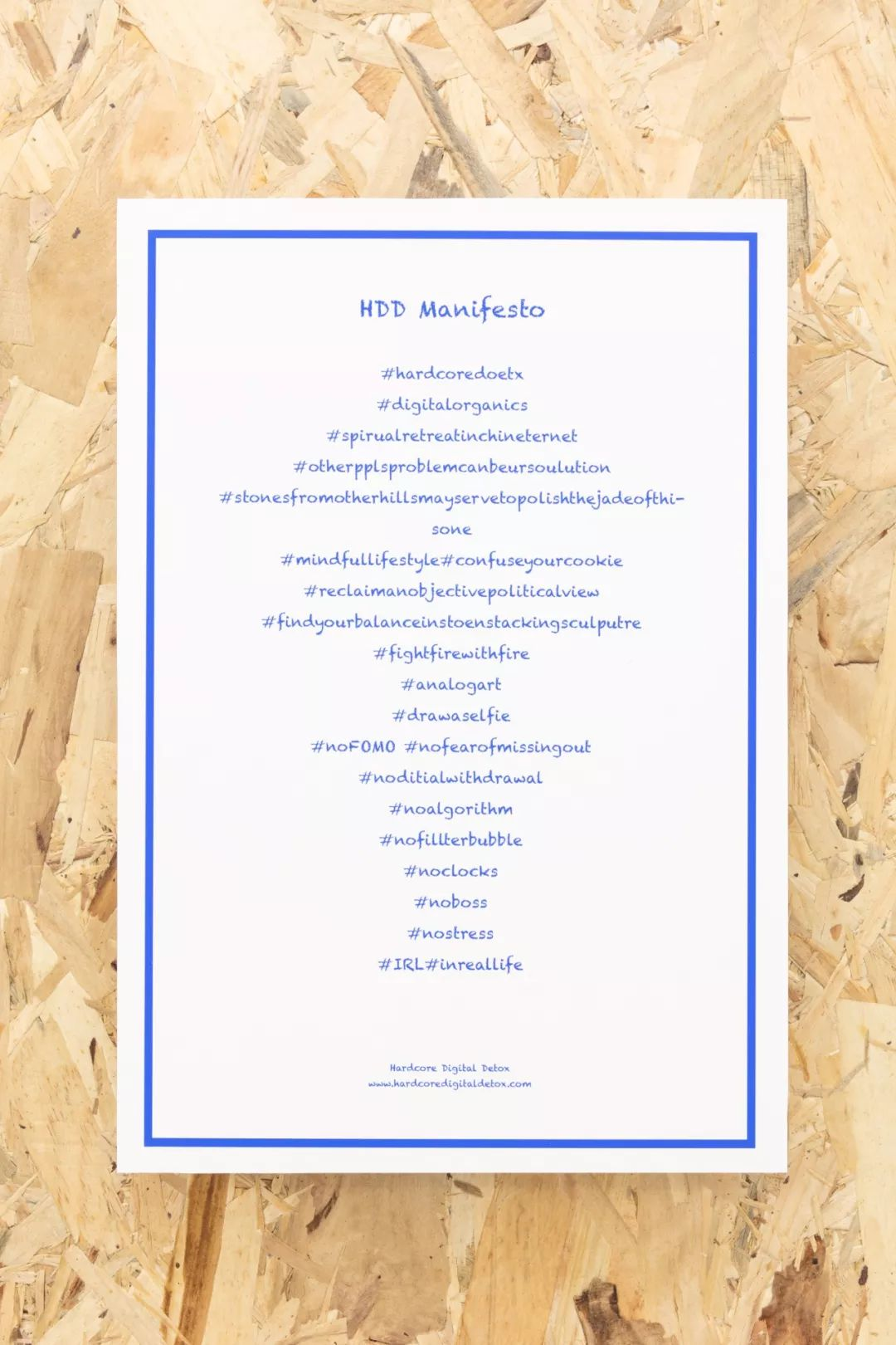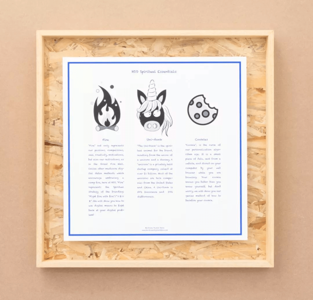 人们似乎比任何时候都需要逃离科技的控制, 当下流行的“数据排毒”是一个限制人们使用电子网络设备(如智能手机和电脑)的过程,这被推举为信息时代的新型养生方式;概念品牌 “HDD(硬核数据排毒)”受到后物质社会中不断生成的生活方式品牌启发,他们靠销售生活方式来贩卖产品,而展览中苗颖也采取了这样的方式向观者推销策略性的生活方式建议。 HDD的硬核之处在于建议一种简单粗暴的 “以毒攻毒”的数据排毒新方式,以此来达到出人意料的治疗效果。