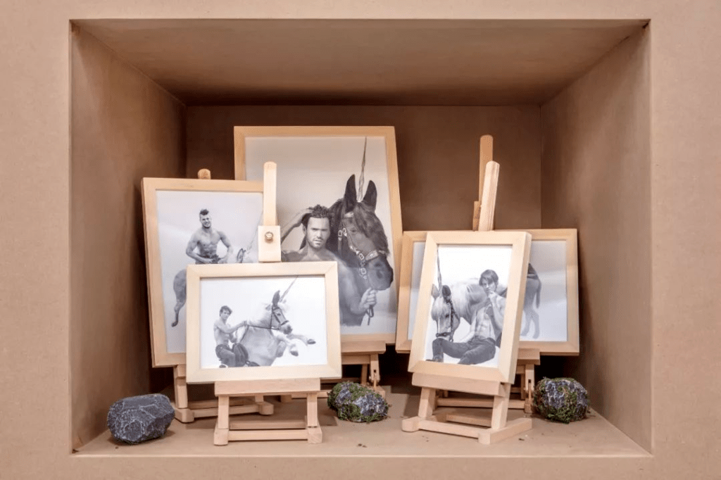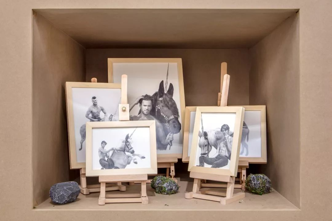 在其中一个展柜里摆了一些黑白小画,凑上去看,发现扎克伯格、马云之类的网络大佬的脑袋被安在了肌肉男的身上,他们或手持独角兽的角,或骑着独角兽,显得荒诞可笑。