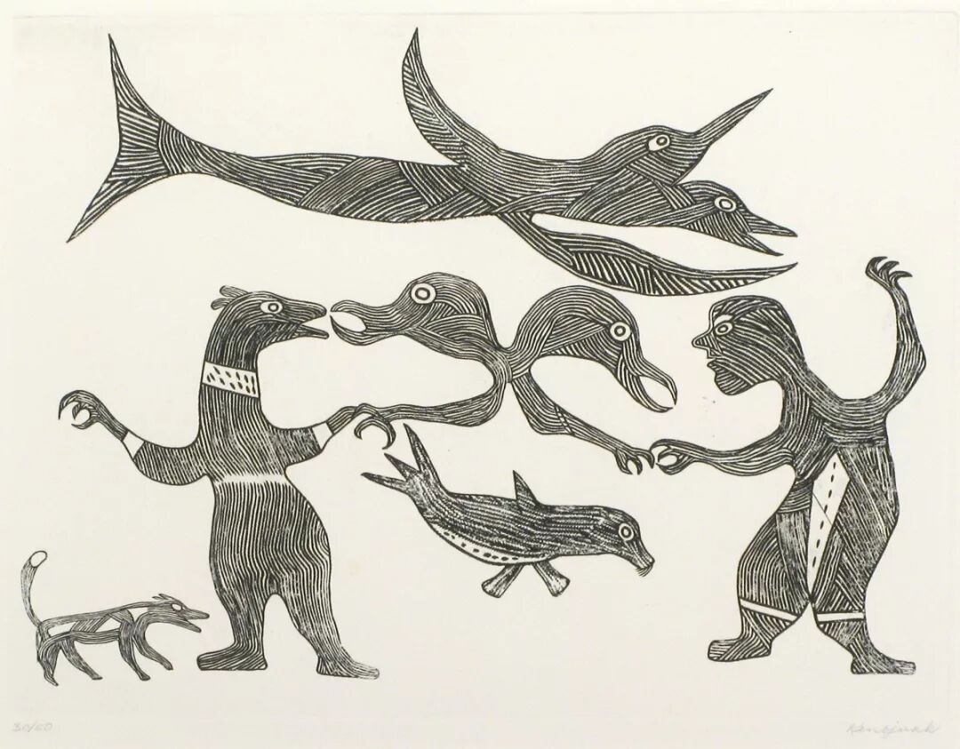 此次展出的三位因纽特艺术家的作品让我们看到了温暖可贵的野性共生的平视目光,并重新记忆起作为一种人类传统的野性共生。因纽特,意即人类。肯胡克·阿什瓦克的版画作品以虹光般的绚丽色彩描绘张扬生长的生命力,鸟兽在简洁的轮廓间变形,洋溢着一种单纯的极富感染力的快乐。舒薇奈·阿绍那的《触角》(2018)在浅蓝底色中央画了一只灰色大章鱼,它有很多触角,头部围着一圈细小的只有眼睛与嘴巴的人的头像,金色的链子缠绕着它,两头分别拴在两个地球上,一个陆地远多于海洋,一个则相反。蒂姆·皮特修拉克的《歌声交流》(2014)背景采用黑色石墨,以彩色铅笔勾勒出一条人鱼的形象。人身穿着传统因纽特服饰,脸上带着白色面具;鱼尾的造型让人联想到鲸鱼、海狮与海豹。北极动物既是因纽特人的食物来源,也是其艺术描绘的主要对象。在艰苦恶劣的生存环境中,因纽特人对与自然、动物的共生体会从质朴的绘画中流露出来。