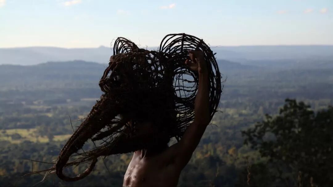 克韦·桑南,《精神之道》,2016-17年,11组雕塑装置(藤、竹编、钢铁),双频彩色有声高清录像,尺寸各异;18分43秒,作品受第十四届卡塞尔文献展委托创作,由Nget Rady编舞及表演