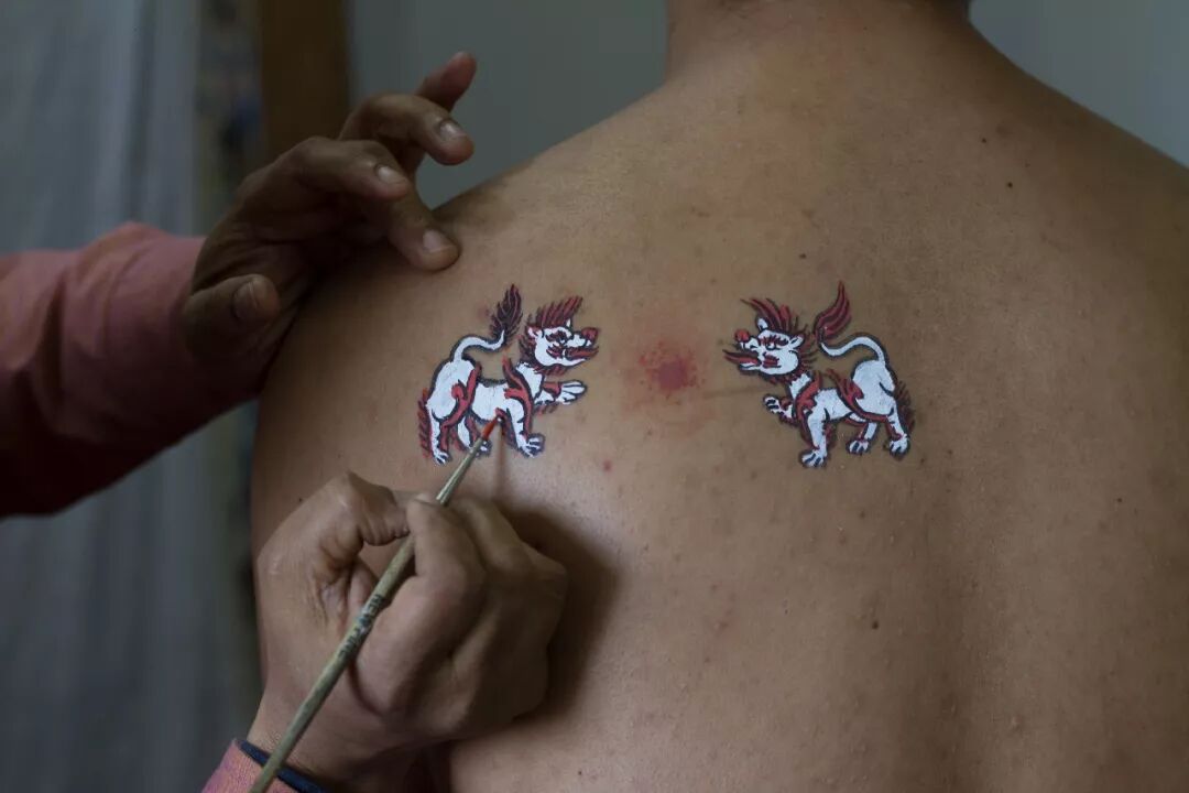 洛克·奇特拉加,《洛克·奇特拉加在带状疱疹患者身上绘制疗愈灵狮》,2019年,摄影,3幅,每幅38 × 25 厘米,由艺术家提供,摄影:Sheelasha Rajbhandari