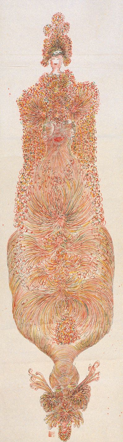 郭凤怡,《泸沽湖——假如女人统治世界》,2002年,宣纸彩墨,267 × 65 厘米,带框290 × 88.5 × 8 厘米,由艺术家及长征空间提供
