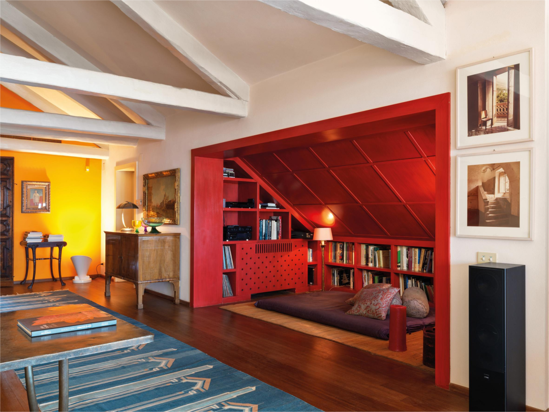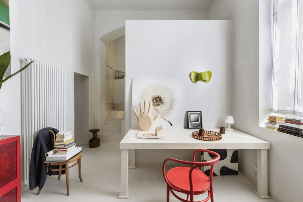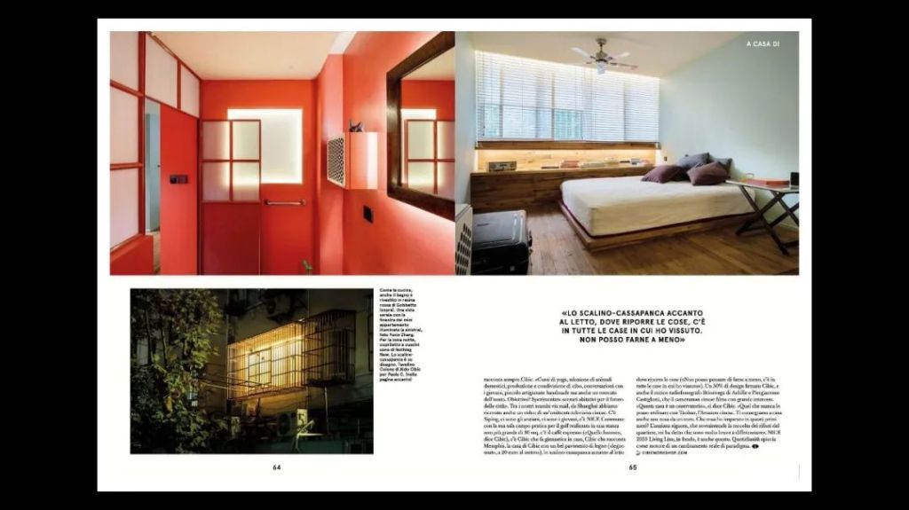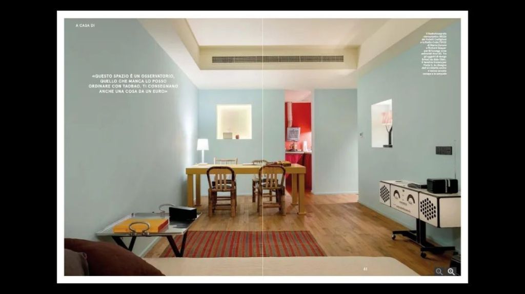 上海版跟米兰同样简单:坐落于杨浦区某新村的老式住宅里的一套单间,被他改造成自己的理想居所——仍是红色主调的小厨房,靠墙最醒目的一件家具是来自意大利故乡的特产:知名音响品牌 brionvega 旗下长得像可爱小机器人的 RR126;再来点儿意式接地气 (genius loci) ,比如餐桌旁三把本地常见、颇具年代感的沪式竹椅子。