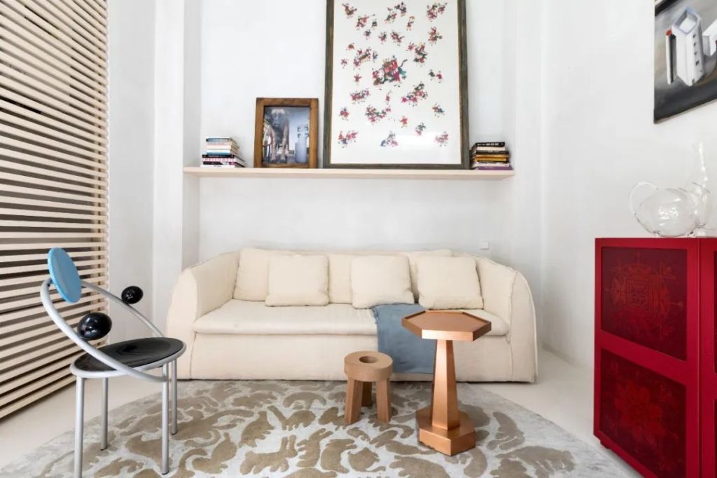 当尺度从笔记本手绘、积木玩具感的家具来到现实中的房间,Cibic 的室内设计却给人一种退居背景的感觉。用他自己的话来说,是意在培育一种人与其境之和谐 (a rapport between people and their context) 。继 Via Carducci House (1998) 之后,他在米兰和上海先后做了两个 “蜗居” 公寓:在米兰的四十平米房间完成于 2018 年,客厅里摆了他自己设计的工作桌、椅子、沙发和柜子,地上铺着浅色版的《快乐地毯》,“好朋友”甜甜圈凳子和大象挂件也都在适合它们的位置,墙上还挂着一幅 Cibic 自己绘于 1989 年的超现实主义风格画作,画面的主角是他在同一年设计的一盏小房子造型的台灯 Kubetto。