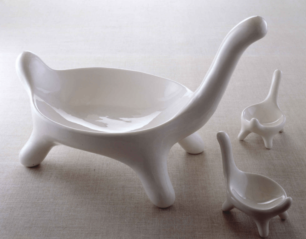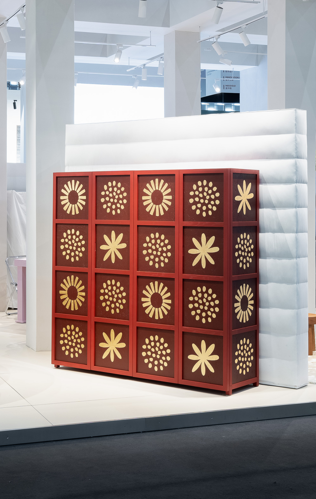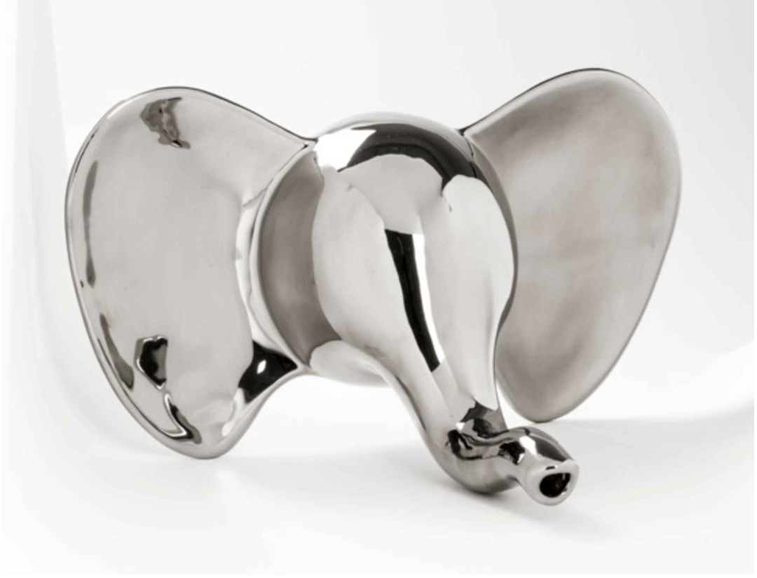 这两个迷你 “家具房间” 诞生于八十年代初,那是工业化批量生产的青春期,也是 Cibic 的创作青春期。摆脱单一的使用功能性考量、强调视觉表达上的自由是 Cibic 的设计起点、即孟菲斯的核心理念。这让他常以轻巧的游戏姿态赋予工业化产品以温度,通过灵活运用造型与色彩来中和工业化材料的肌理、重量与质感。从 2002 年的恐龙妈妈和恐龙宝宝造型的陶瓷果盘,到近年来的明星设计——象头挂件及其延展设计象头喷泉,他早期作品中的积木玩具质感一直延续至今。设计上海 2021 将特选奖颁给了 Cibic 的 Tibetan,这个柜子就好像是用 16 块正方体积木搭起来的。同场展出的还有一把叫 “甜甜圈” 的小凳子,一如 Cibic 在介绍中写道,它不仅是一件趣味盎然的设计,“也是一个好朋友”。