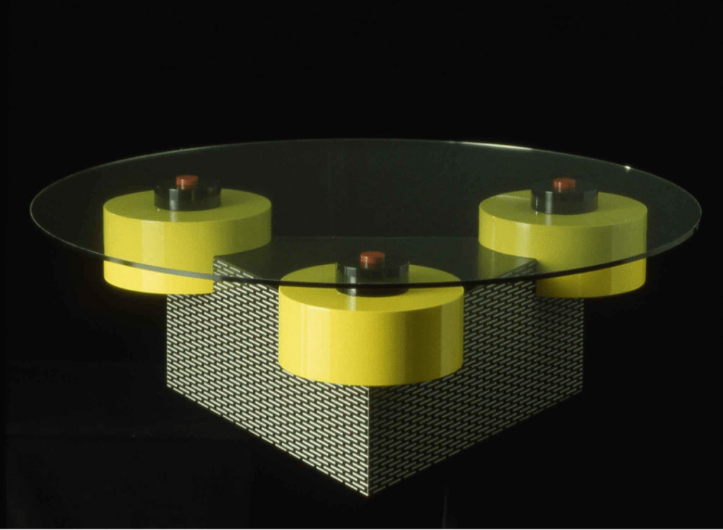 一件家具还可以是一组玩具:Atlas (1982) ,另一张咖啡桌:模拟屏显的黑白砖网图案包裹着三角基座,叠加在上方的玻璃台面与之共谋出视错觉,让人以为它其实是正方形的。衔接台面与基座的三个圆形 “零件” 以一层亮黄色、一层黑色和一层红色堆叠成夹心奶油蛋糕。它像一座位于山顶的 360 度全景瞭望台,用 “积木玩具”、“汉诺塔”、“电路板” 和“按钮”拼搭而成。