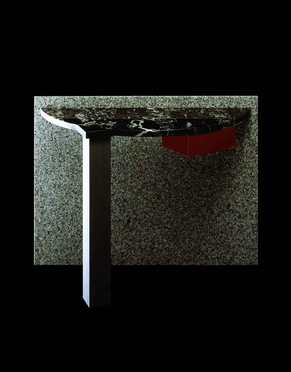 一件家具也可以是一个房间:Belvedere (1982) 是一款咖啡桌的名字,在意大利语中,bel 是美好的意思,vedere 是看,合在一起,就字面译成 “好看”。它是早熟少女版的密斯 · 凡 · 得罗:天花板是海面纹理的大理石,立柱是肃穆的花岗岩,墙面则是佛罗伦萨随处可见的灰色 pietra serena(一种蓝灰色砂岩);而在半圆的天花板下、紧挨着方正的墙面、远离棱角有形的立柱,是个红色小方块:就像少女偷了妈妈的唇膏、穿上妈妈的职业套装,偷偷抹上红唇。