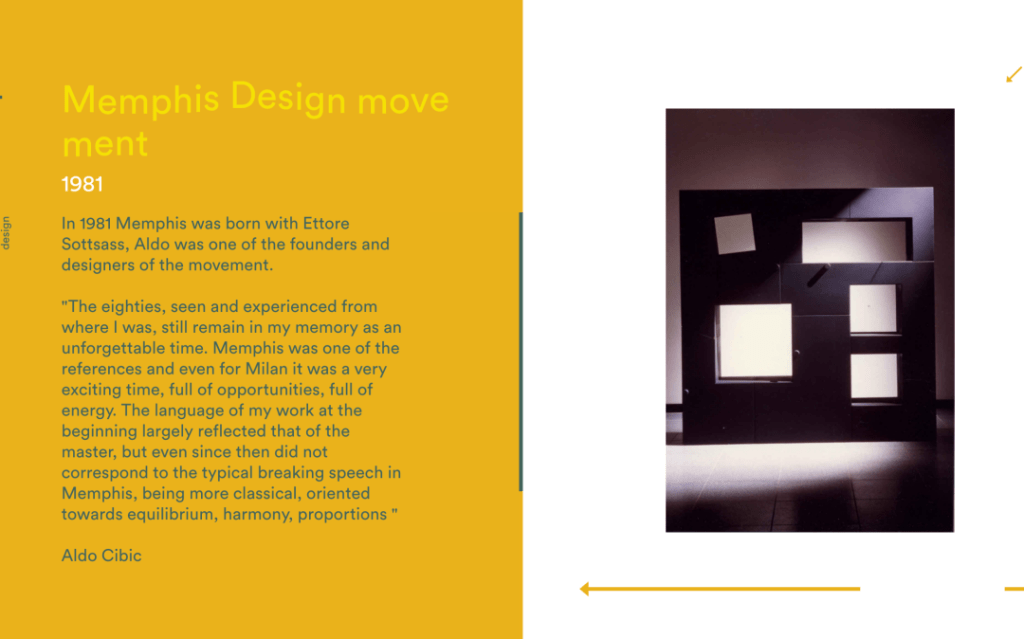 而这份博杂履历的起点,在所有熟悉现代设计的人看来都是闪耀夺目的:他是反对纯粹功能主义、强调 “看” 的趣味的孟菲斯运动团体中最年轻的创始成员,曾与意大利设计大师 Ettore Sottsass 并肩共事。而孟菲斯作品中常见的 Daniel Buren 式的直条纹、明亮色彩与游戏姿态,也常见于 Cibic 的创作。尽管如此,他早就清晰地自察与孟菲斯激进语言的“偏离”,而趋向一种“更古典、均衡、和谐的尺度”。