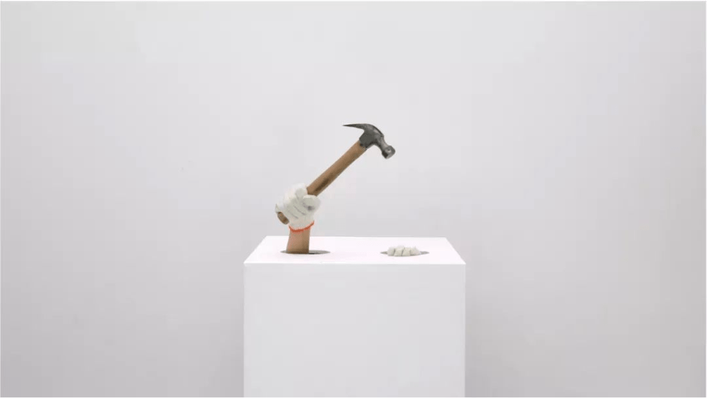 于是在开幕当天,布展师傅陈俊在观众的注视下把装着我的白盒子抬到现场。我有意将这两个时空折叠,编织出三条对应的关系——两种劳动,两种手套,两个锤子。我表演劳动的手势,而工人在我的表演过程中,安装《工作姿势》这件影像作品,成为表演的一环。我在戴着粗麻布劳保手套时使用了各种布展工具,而戴上精编棉布手套后,我的手势不再指向任何具体的动作,而只是优美的滑动。锤子先是在布展时作为不可或缺的生产工具出现,而在表演中的“拍卖”环节则作为定价象征的演示物登场。总体而言,我试图混淆表演和劳动,或者说重新定义表演。它不仅是在观众面前呈现的现场,而是劳动、研究、存档、建构和呈现的整个过程。