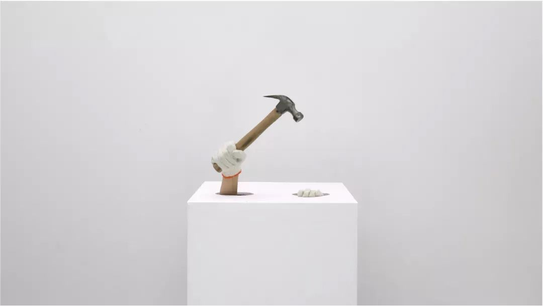 于是在开幕当天,布展师傅陈俊在观众的注视下把装着我的白盒子抬到现场。我有意将这两个时空折叠,编织出三条对应的关系——两种劳动,两种手套,两个锤子。我表演劳动的手势,而工人在我的表演过程中,安装《工作姿势》这件影像作品,成为表演的一环。我在戴着粗麻布劳保手套时使用了各种布展工具,而戴上精编棉布手套后,我的手势不再指向任何具体的动作,而只是优美的滑动。锤子先是在布展时作为不可或缺的生产工具出现,而在表演中的“拍卖”环节则作为定价象征的演示物登场。总体而言,我试图混淆表演和劳动,或者说重新定义表演。它不仅是在观众面前呈现的现场,而是劳动、研究、存档、建构和呈现的整个过程。