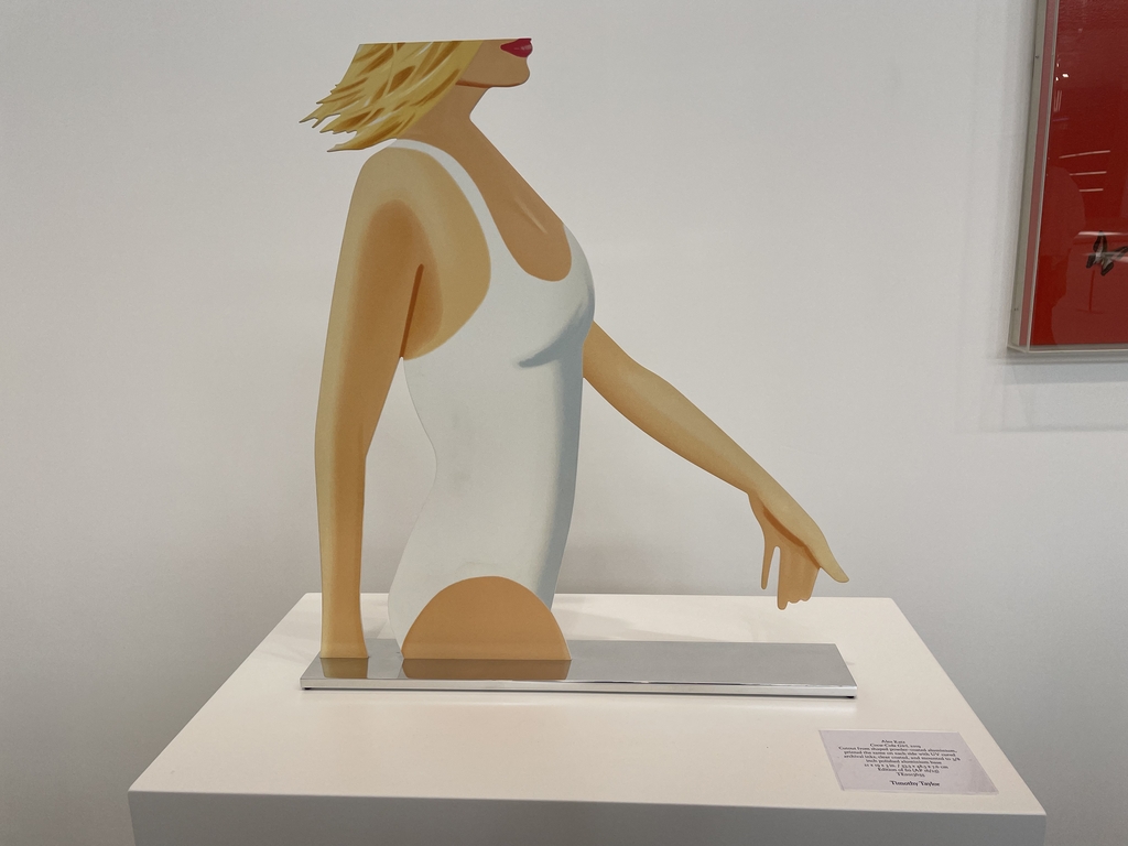 亚历克斯·卡茨(Alex Katz, 1927)的《Coca-Cola Girl》(2019)以其代表性的简洁生动与明媚光照的色彩将一位金发、红唇、身着露背纯白连体泳装、曲线窈窕的女性侧像以双面印刷粉装铝板的形式展现出来,显得非常轻盈灵动。原本方方正正的画板的纯色背景在这件平面而立体的作品中换成了画面周围的空气,从而更突显出女郎的飒爽英姿,仿佛行走生风。这件灵感得自早期美国广告画板中形象演变的创作巧妙翻译了消费图像的诱人娇媚,并呈现出区别于艺术家更常见的油画媒介的别致感。