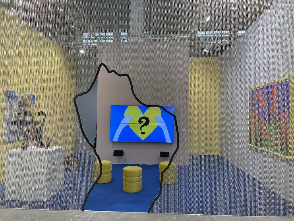 如你所见,一个艺博会,跟其他行业的博览会在空间布局上是很类似的:它由许许多多隔间构成。临时搭建起来的展墙把原本冲压车间庞大的整体空间分割成大大小小的隔间,但没有那么封闭,我们还是可以在每个隔间同时看到一些邻近的空间。所以我们大多数时候视线里能同时看到五花八门各类艺术家的作品。每个隔间就是一个画廊展位,有些是艺术家个展,就是说这个展位里所有的作品都来自同一位艺术家;有些则选择了不同艺术家的作品;有的是艺术家明星,有的可能在国外很有名、但对国内尚且陌生,还有相对来说比较新兴的艺术家等等。从排布上来说,位置相对主入口而言更显著一些的画廊会比较大牌一些。