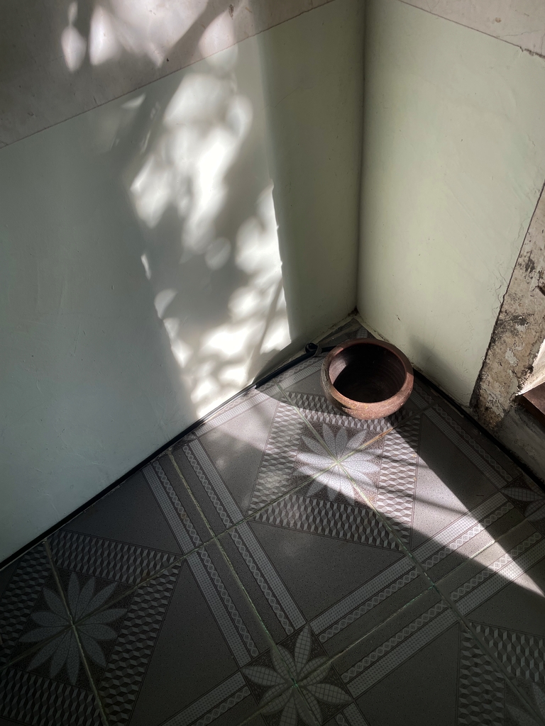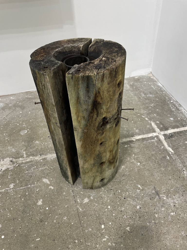 我在一个很不起眼的角落发现了一件很不起眼的小物件:一段中间劈开、表面斑驳的老木和套在中间的一个玻璃瓶。这是傅丹(1975)的《无题》(2022),在今年威尼斯双年展期间,应Querini Stampalia基金会的邀请,诞生在以玻璃生产与工艺著称的Murano岛上。这段木头是他在当地玻璃厂中发现的烧制多年的玻璃模具,如今仍能在其表面看到炭火留下的黑痕和固定用的长钉。这让我想起前不久在广州镜花园探访的傅丹的《回空间》,那是美妙的气候、植被与遗弃老屋、家具和物件的温柔对话。包括房屋在内的年代久远的现成品,在艺术的“策划”下成为召唤过往时间的灵器。即便是在嘈杂的艺博会现场,这类作品也能让我调取与之关联的视觉记忆,将脑中“那一边”的形象空间移动到眼前来。
