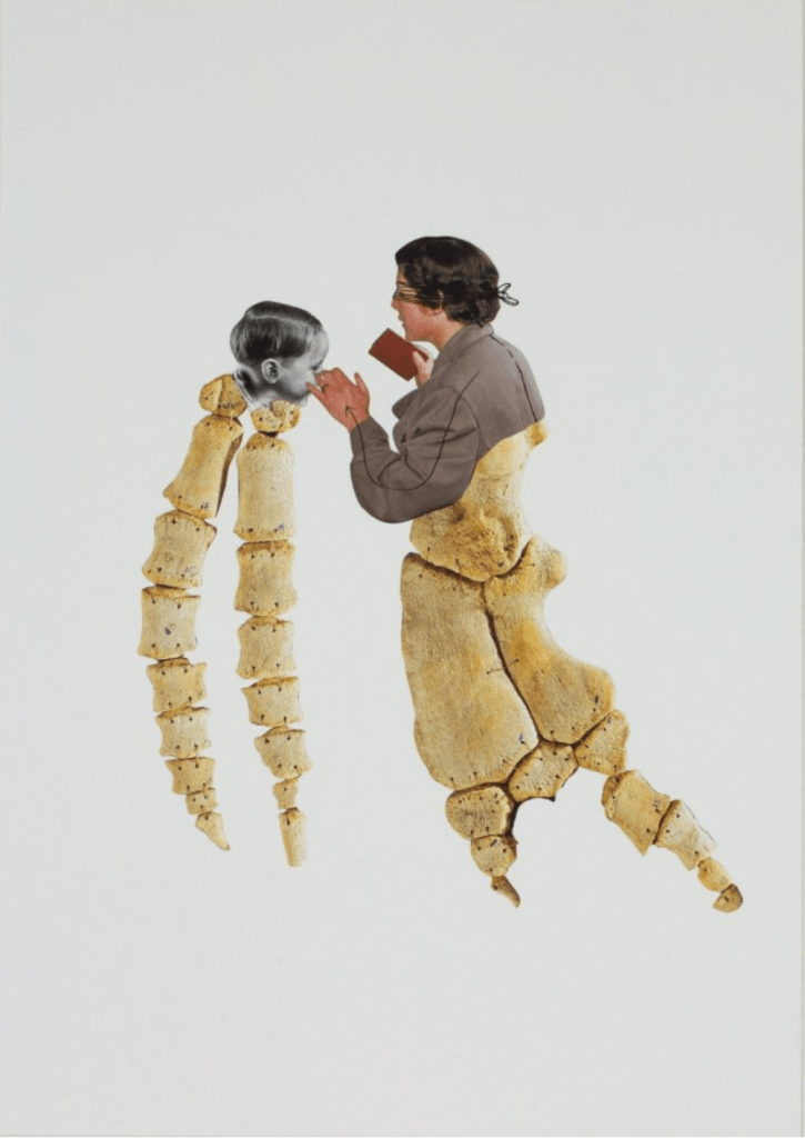 “周三早晨:终于来了一些玩意儿。先是一只鞋。穿过的。然后是一条桌子腿。即便一条是腿一只是鞋,但它们不成对儿。”这是伊娃·卡托塔法(Eva Koťátková, 1982)俏皮的《胃的日记》(Diary of the stomach, 2017)文字中的一小段。顾文知意,这是某个“胃”写的一篇日记。现场展出的是与这组日记对应的纸本拼贴作品,它们来自同名的剧场式展览。卡托塔法的创作运用大量历史档案的图像,并穿插运用人和动物的身体形象、日常物件、软性的布料等综合材料,在表演性的环境中运用得相当灵活,能以狡黠的幽默感探讨沉重的历史话题。与之邻近的棉布挂毯《共同/单独5》(Zusammen/Allein V, 2020)来自乌拉·冯·勃兰登堡(Ulla von Brandenburg, 1974),同样是以剧场表演作为其为人称道的创作方式,勃兰登堡运用纯色的多彩几何布料拼贴探索宗教外的仪式感。