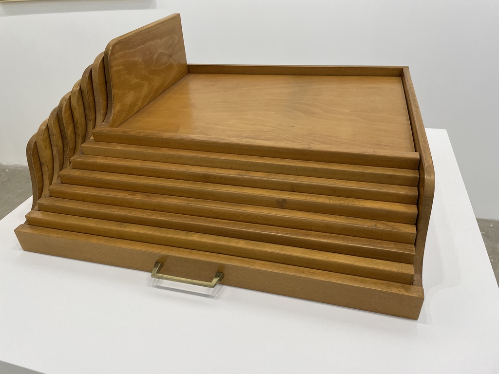 罗曼·昂达克(Roman Ondak, 1966)的《成为一排》(Becoming a Row, 2019)是一叠八层严丝合缝、没了内部空间的抽屉。这位以行为表演与木制结构著称的艺术家将抽屉这一日常物改造成了一个形式雕塑。虽然把手和每层的比例样貌仍保留着抽屉的特征,但由于层层堆叠而不再能放入任何东西。或者说,这是“抽屉的抽屉”。