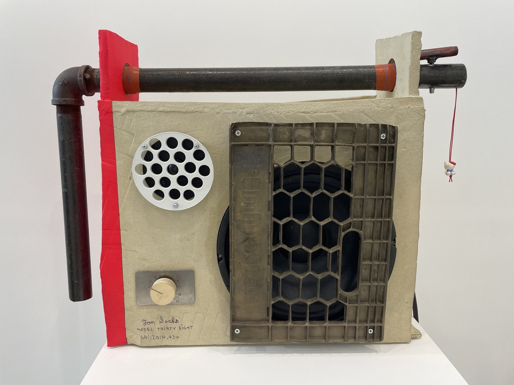 我还想简略提及四件以各自趣味运用日常物件的作品:莫娜·哈透姆(Mona Hatoum, 1952)在一个嵌有透明玻璃的优雅木柜中以类似曾经珍宝柜的藏展方式摆放被压扁的、形成奇异形态的玻璃瓶——《无题(展示柜)》(Untitled (display case), 2021);爱丽丝·安德森(Alice Anderson, 1972)用铜色环保电线包裹DVD遥控器、USB钥匙、手机屏幕的《精神机器,第52号雕塑》(Spiritual Machines Statuette 52, 2021);汤姆·萨克斯(Tom Sachs, 1966)用炻器、矽青铜、瓷器、钢制硬件等混合媒介DIY的音乐播放器《铺设管子》(Lay Some Pipe, 2014);还有谭天(1988)在一如既往地调侃当代艺术运作机制的画作旁靠着的一面以丙烯涂绘边框的镜子。他们的创作似乎都游走在日常物件与艺术品转化的边缘,一边是弱化作品感的现成物件,另一边则是颇具趣味的审美物件。