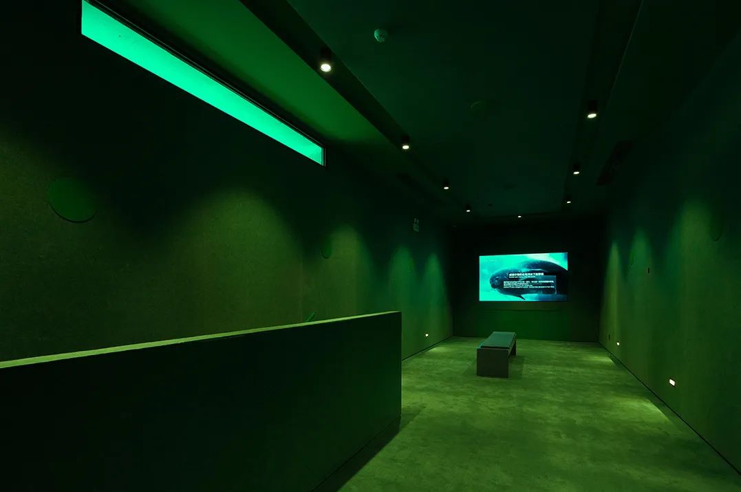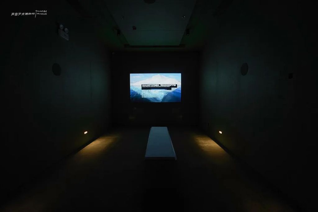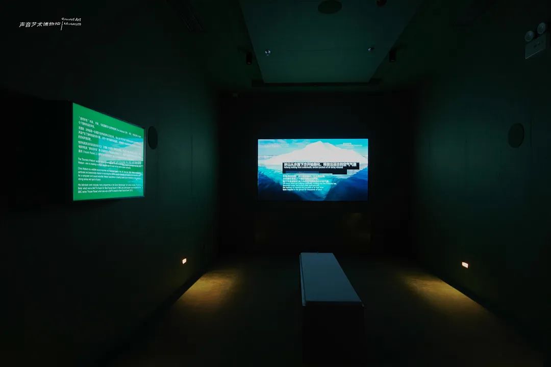 经过一小段走道,还携带着老北京的余温,步入荧荧绿意的幽暗房间后,移动门在身后自动关上。狭长展厅中左右两端的屏幕上显示着幽蓝冷白的南极风光,心里的温度也随之沁凉下来。冰川移动的声音、阿德利企鹅的叫声、威德尔海豹在水面下的歌声…… 这套时长 40 分钟、来自南极洲的声场直送是博物馆与英国著名大自然录音师克里斯 · 沃森(Chris Watson)合作的地球七大洲自然声场的初展单元。沃森曾为环保界大名鼎鼎的大卫 · 艾登堡(David Attenborough)与 BBC 合作的系列纪录片《生命》(Life)实地录音。同样采用了专业的定制音响系统,绿房间适合闭眼聆听、陶醉自然。