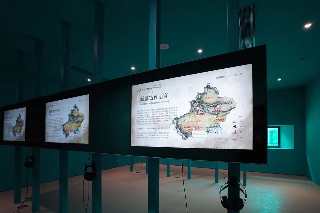 在两排站立式检索屏上,收录着新疆地区包含中古汉语、梵语、回鹃语、粟特语等 14 种古代语言的出土文献与对应音频,这些文献涵盖官方 / 法律、经济、学习、医疗、家事等主题,来访者可以通过点选屏幕听到考证还原的语音,阅读这些抵抗时间保留下来的书信、契约、遗嘱、药方、命令等文本。这些珍贵文献亦是从公元前 1 世纪到公元 14 世纪,世界多民族在新疆地区的文化融合之 “迹”。这一展区的内容会每两月更新一期,据称后续计划有古诗词的语音内容。