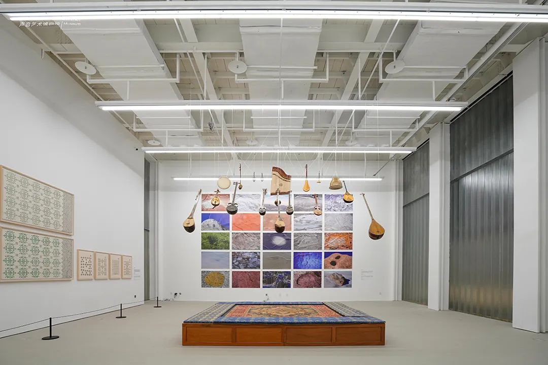 白房间的墙面上还展示了系列摄影作品《万物》——艺术家庄辉用镜头捕捉下的和田的地质、地貌;以及系列纸上图案作品《雅克西姆 / 斯孜》——艺术家旦儿运用收集于和田民间的凸版印染工具木质模戳在定制的加层宣纸上拓印出新的图案画面。