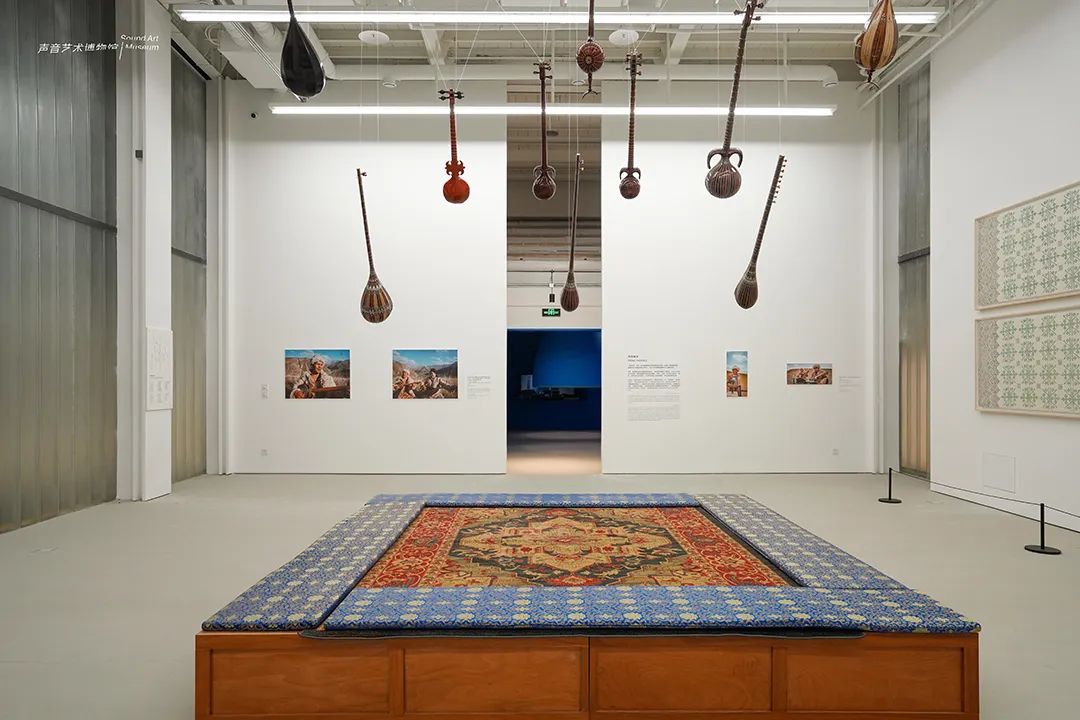 与蓝房间紧接的挑高白房间正在展出此单元的展中展 “和田和声”。音乐,是和田生活文化的有机部分,音乐天赋让当地的人们随时随地都可开唱;聚会、吃饭、聊天时,顺势、瞬时就来了此起彼伏的歌声。现场播放的一部录像展示了四位民间艺人弹唱及舞蹈的特别形式 “跳山羊”:艺人一边弹奏、歌唱,一边借绕在手上的绳线牵动一只站在鼓面上的山羊小偶;于是随着手指牵动的节奏,山羊小偶便迎着歌声跳起舞来,生动极了。