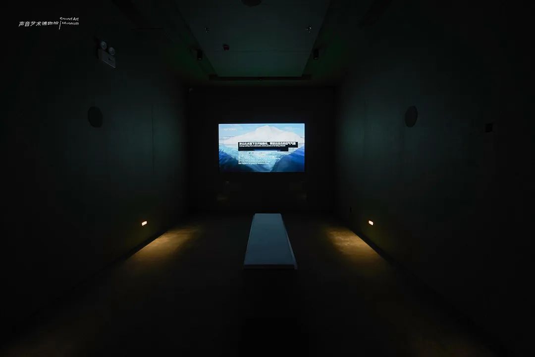 经过一小段走道,还携带着老北京的余温,步入荧荧绿意的幽暗房间后,移动门在身后自动关上。狭长展厅中左右两端的屏幕上显示着幽蓝冷白的南极风光,心里的温度也随之沁凉下来。冰川移动的声音、阿德利企鹅的叫声、威德尔海豹在水面下的歌声…… 这套时长 40 分钟、来自南极洲的声场直送是博物馆与英国著名大自然录音师克里斯 · 沃森(Chris Watson)合作的地球七大洲自然声场的初展单元。沃森曾为环保界大名鼎鼎的大卫 · 艾登堡(David Attenborough)与 BBC 合作的系列纪录片《生命》(Life)实地录音。同样采用了专业的定制音响系统,绿房间适合闭眼聆听、陶醉自然。