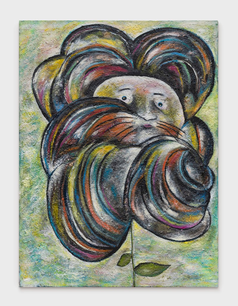 对于绘画来说这既是其古老的本职亦是当今观画难得的惊喜:画有了自己的生命,独立而且表现出神秘的原初状态。这份可爱并不那么轻松,尽管它大方借用了一点漫画的能量,但画家显然对市面上光鲜的、定式化的可爱做了好一番挣扎。如果要说这些画的滋味,那么在它们诱人的酸甜里,还夹杂着几丝咸味。格罗内迈尔的画面构图并没有简单地根据作品尺幅而改变,画面色调也不尽相同、富于变化。大幅的《留下》(Stay,2022)可以说“只是”画了一株好似毛毡做的丰满花朵,背景仍是一片柔和的柠檬浅草色调的清新背景;她妩媚的笑脸让人想到卡罗尔在《爱丽丝梦游仙境》中描述的那些个性鲜明的会说话的花朵。在毛茸茸的笑脸两侧,用于描绘花瓣的弧线组成一对猫胡子。而在类似尺幅的《我们是如何相遇的》(How We Met,2023)中,两手相交的两人背影,和双臂相接处后脑勺对着画外的一只小猫,跟一朵饱满的充了气的鲜红发光的大花朵,营造出略带伤感的叙事氛围,搅动着画外人的心绪与想象。